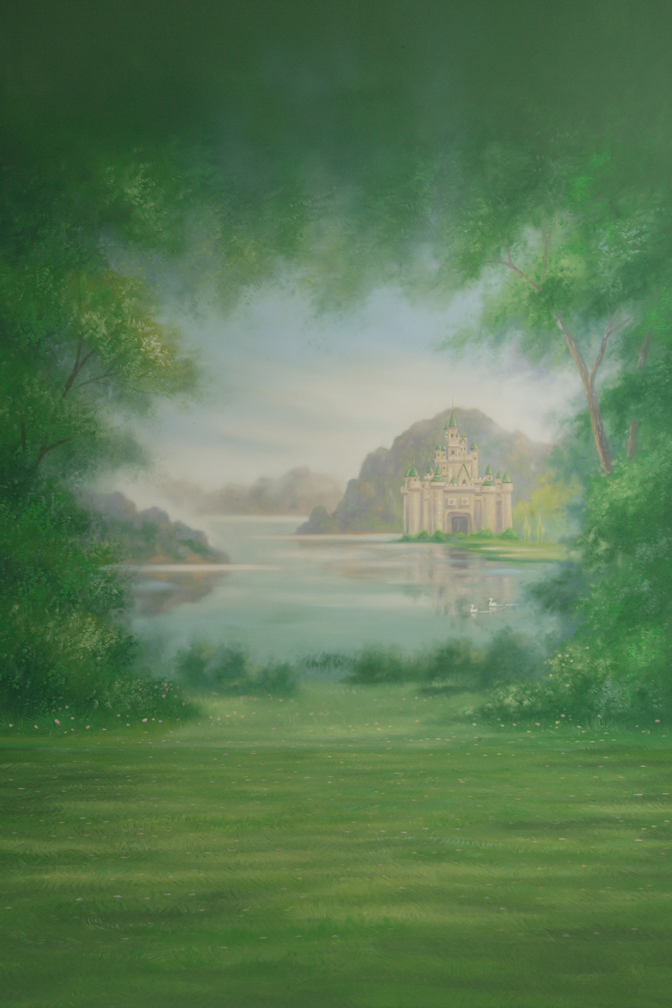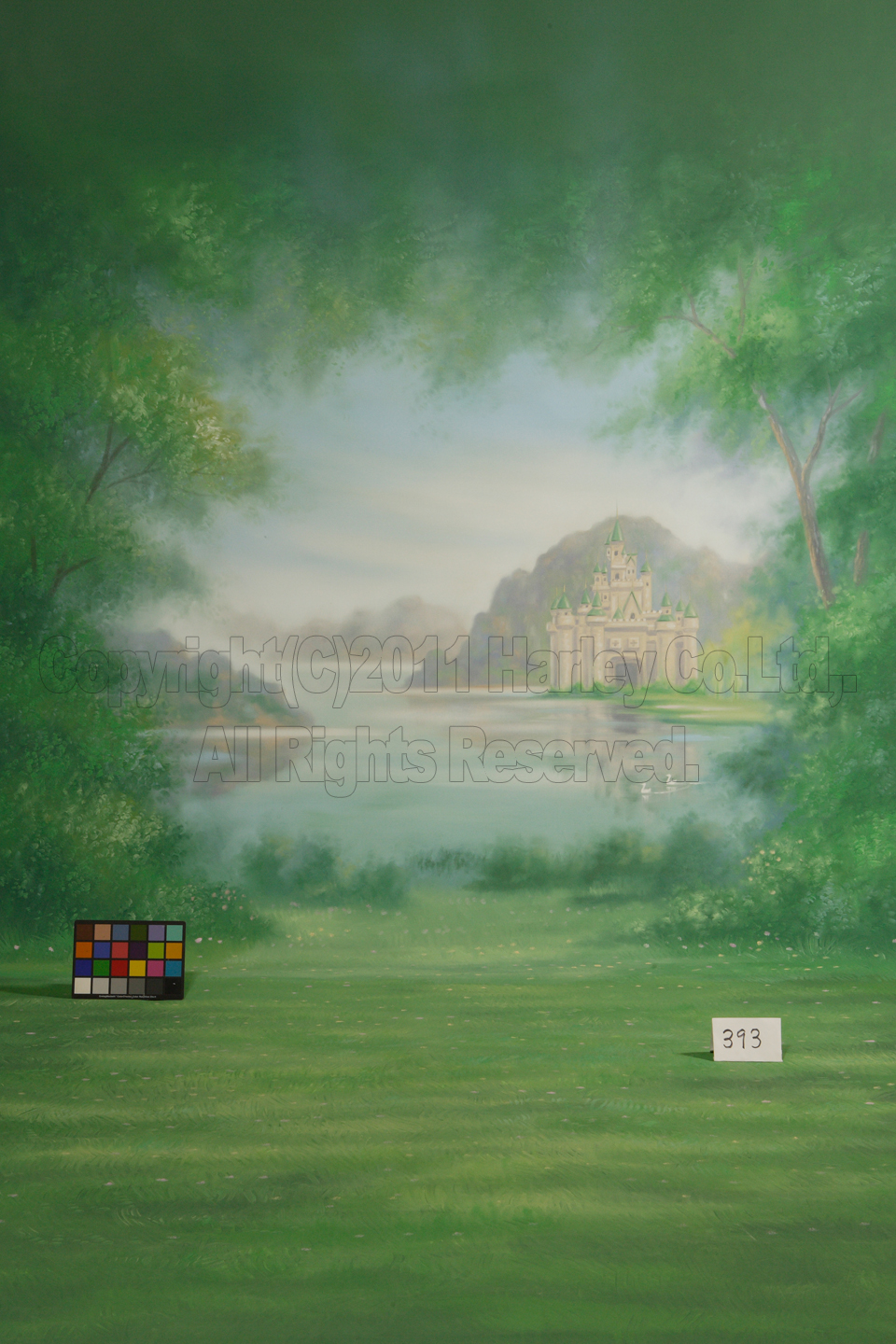 絵バック 2.9×7m No.0393¥330,000森の中から、湖のほとりにある城が見えるファンタジーなデザインです。ドレスでの撮影や、ベビー・キッズ等の撮影に最適で